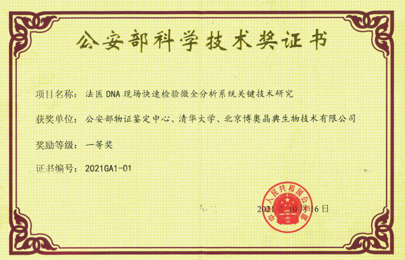 “便攜式全集成法醫(yī)DNA物證現(xiàn)場快速檢驗(yàn)微全分析系統(tǒng)”榮獲公安部科學(xué)技術(shù)一等獎(jiǎng)