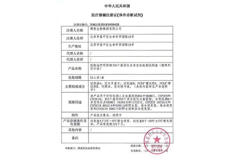 抗栓治療用藥相關(guān)6個(gè)基因位點(diǎn)多態(tài)性檢測試劑盒(微陣列芯片法)獲醫(yī)療器械注冊證