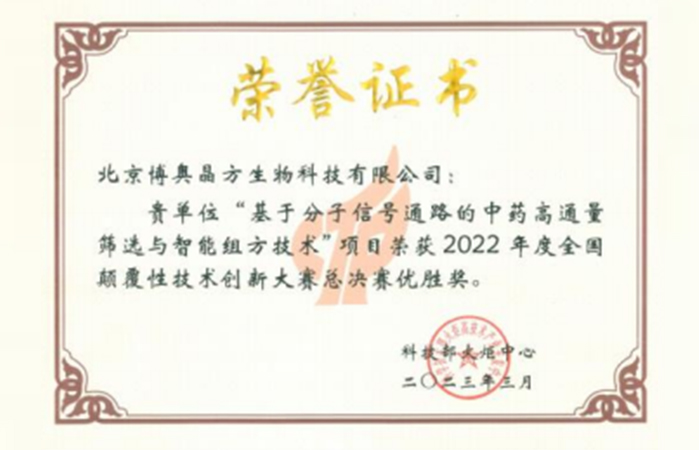 博奧晶方“分子本草技術(shù)”榮獲由科技部主辦的全國顛覆性技術(shù)創(chuàng)新大賽總決賽最高獎(jiǎng)-優(yōu)勝獎(jiǎng)