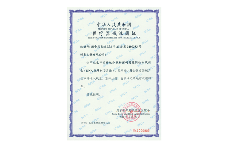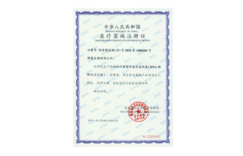 分枝桿菌菌種鑒定試劑盒(DNA微陣列芯片法)獲醫(yī)療器械注冊證