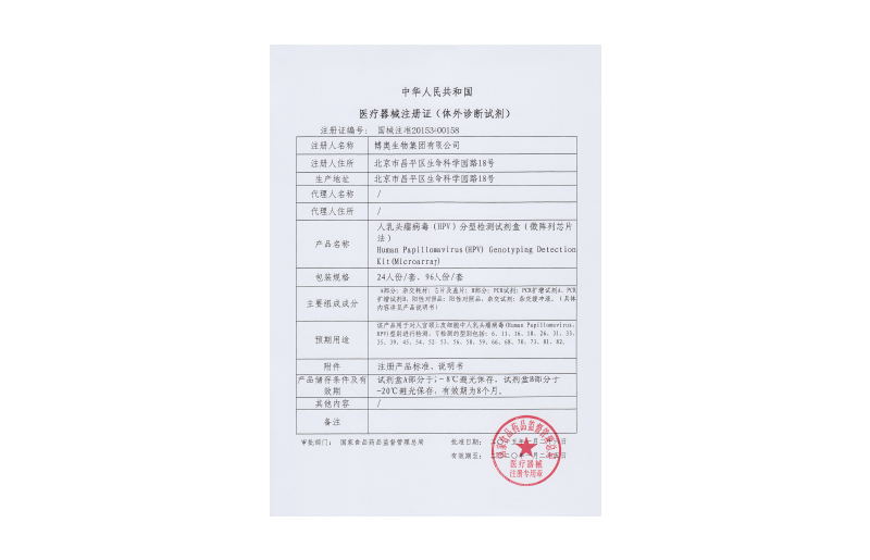 人乳頭瘤病毒(HPV)分型檢測試劑盒(微陣列芯片法)獲醫(yī)療器械注冊證