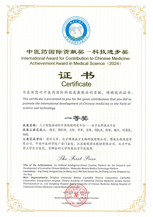 分子本草技術(shù)榮獲中醫(yī)藥國際貢獻(xiàn)獎(jiǎng)--科技進(jìn)步獎(jiǎng)一等獎(jiǎng)
