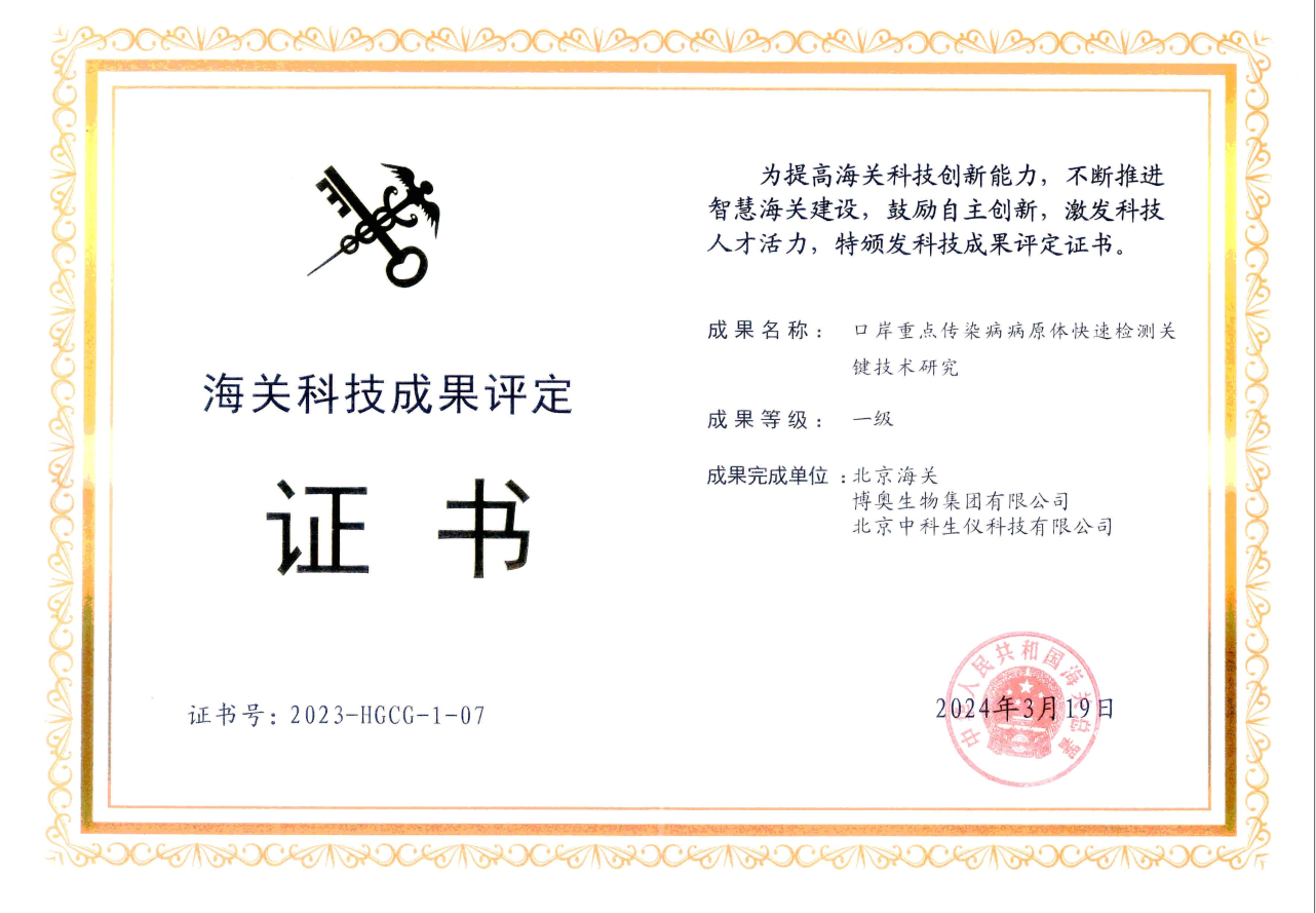 “口岸重點(diǎn)傳染病病原體快速檢測關(guān)鍵技術(shù)研究項(xiàng)目”獲得中華人民共和國海關(guān)總署的一等海關(guān)科技成果評(píng)定