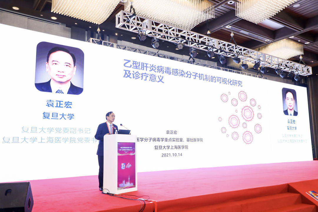 復旦大學黨委副書記、復旦大學上海醫(yī)學院黨委書記袁正宏教授作了題為《乙型肝炎病毒感染分子機制的可視化研究及診療意義》的專題報告。報告介紹了研究團隊利用基于 bDNA 的熒光原位雜交結合免疫熒光技術及 CRISPR-Tag 活細胞實時熒光失蹤技術,系統(tǒng)性地建立了在體外細胞和組織系統(tǒng)進行原位雜交加熒光、顯色檢測HBV核酸和蛋白可視化的方法。通過可視化技術,研究團隊在亞細胞水平直接觀察到HBV病毒組分,揭示了HBV病毒部分關鍵復制環(huán)節(jié)的細節(jié),填補了HBV生活史一些關鍵環(huán)節(jié)的時空信息。在組織水平觀察到病毒核酸與蛋白的分布特征,反應肝臟內(nèi)HBV病毒的生活特征。課題組開發(fā)的可視化技術可以用來監(jiān)測慢乙肝患者抗病毒治療后病毒蛋白質和核酸,尤其 cccDNA 的清除情況,有助于臨床醫(yī)生制訂更好的治療方案,并可為指導開發(fā)新藥物提供幫助。