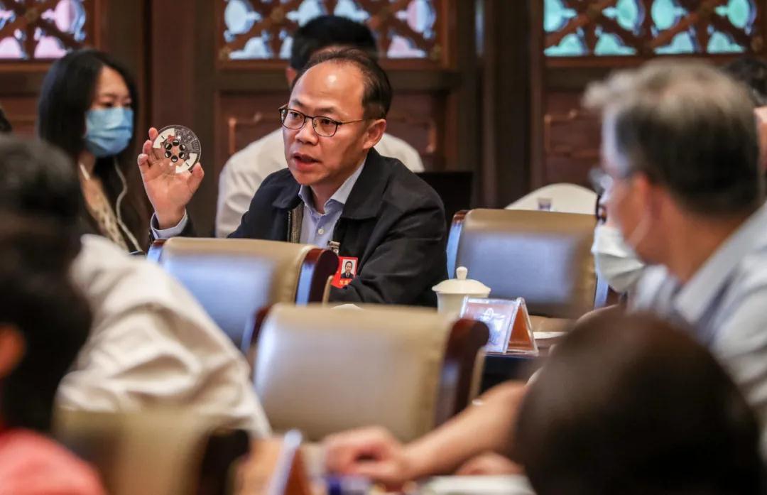 程京代表展示出他和團(tuán)隊(duì)最新研發(fā)的全集成核酸檢測生物芯片,并結(jié)合政府工作報(bào)告就加強(qiáng)公共衛(wèi)生體系建設(shè)暢談自己的看法 攝影/武亦彬