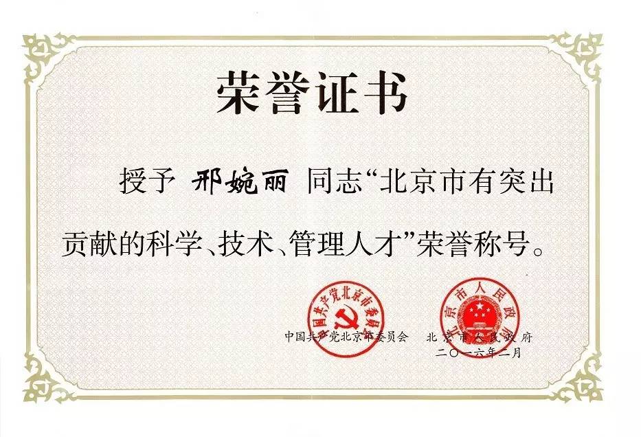 除本次獲得“北京市有突出貢獻的科學、技術(shù)、管理人才”榮譽稱號外,邢婉麗教授還曾獲得2011年北京市“三八”紅旗獎?wù)隆?012年國家工程研究中心先進工作者、2012年中青年科技創(chuàng)新領(lǐng)軍人才、2013年“萬人計劃”科技創(chuàng)新領(lǐng)軍人才、2014年創(chuàng)新教學成果獎等諸多榮譽和獎項。