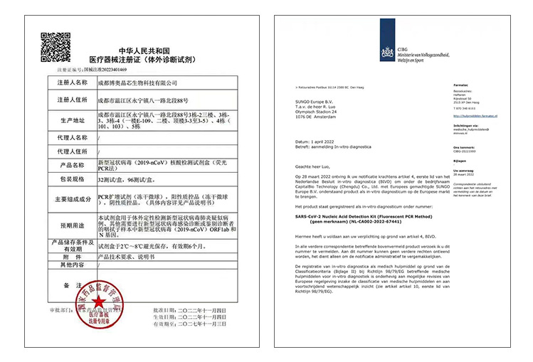 凍干型新型冠狀病毒(2019-nCoV)核酸檢測試劑盒 (熒光PCR法) 獲國家醫(yī)療器械注冊證,并獲得CE-IVD認(rèn)證