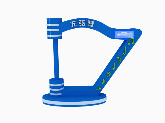 展品由無(wú)弦豎琴、激光束及控制系統(tǒng)組合構(gòu)成。展項(xiàng)設(shè)計(jì)成一個(gè)仿真按比例縮小的豎琴模型樣式,這個(gè)豎琴的琴弦是利用激光發(fā)生器發(fā)射的激光所構(gòu)成的虛擬琴弦。