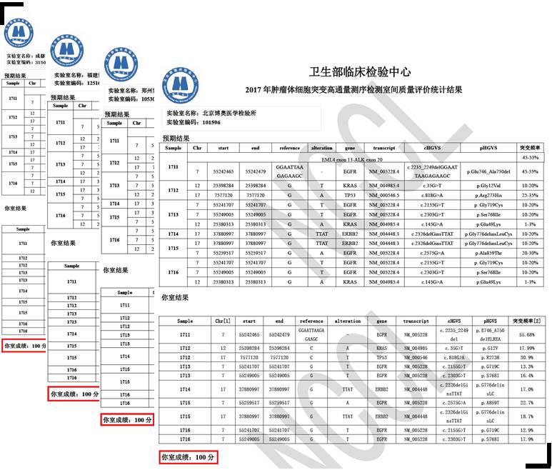 據(jù)臨檢中心統(tǒng)計(jì),本次質(zhì)評中共有102家實(shí)驗(yàn)室報(bào)名參加,92家實(shí)驗(yàn)室提交結(jié)果。 其中獲得100分實(shí)驗(yàn)室42家,不足參報(bào)總數(shù)的一半。作為國家衛(wèi)生計(jì)生委首批高通量基因測序技術(shù)臨床應(yīng)用試點(diǎn)單位,博奧檢驗(yàn)旗下北京、成都、鄭州、福建共計(jì)4家檢驗(yàn)所也積極參與了本次室間質(zhì)評活動,且均以滿分100分通過。