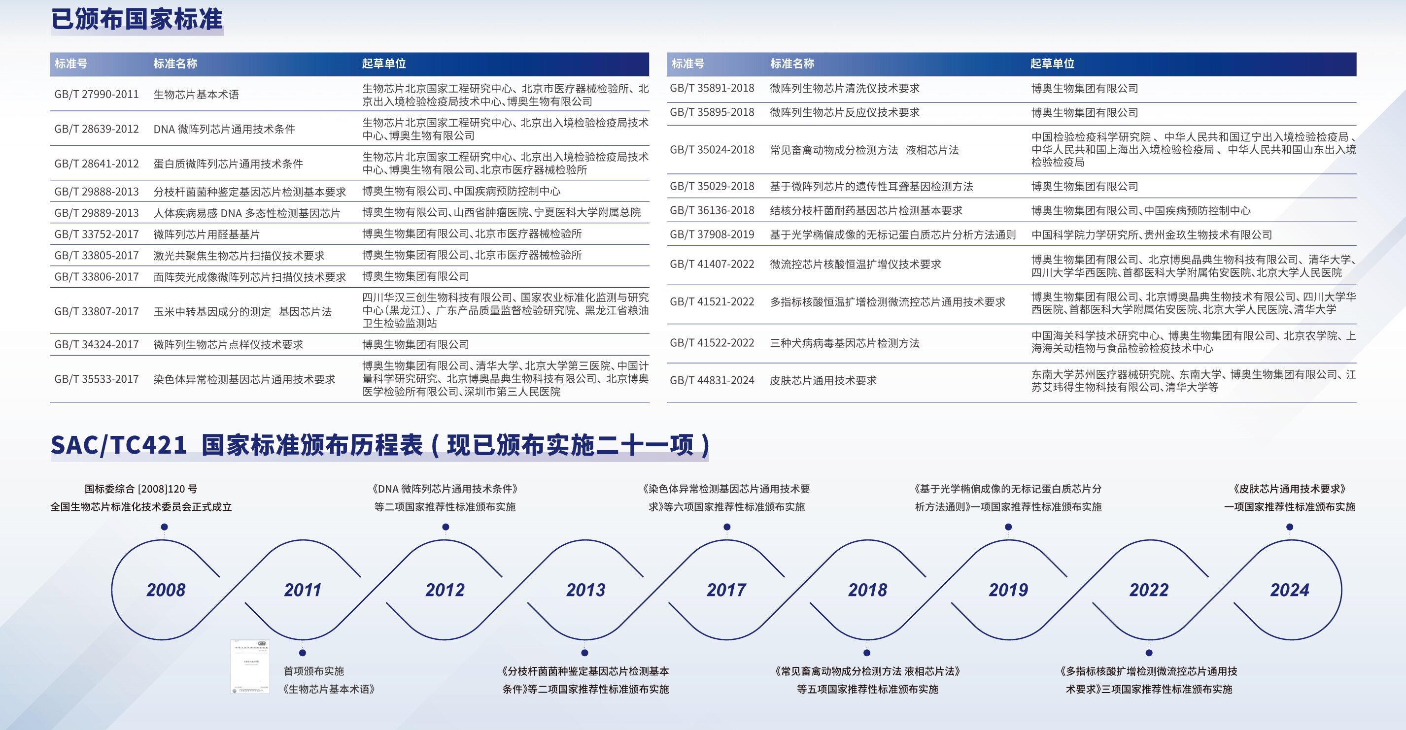 全國生物芯片標(biāo)準(zhǔn)化技術(shù)委員會(huì)(TC421)經(jīng)國務(wù)院標(biāo)準(zhǔn)化主管部門批準(zhǔn)設(shè)立。博奧生物作為TC421的主任委員和秘書處承擔(dān)單位,全面負(fù)責(zé)生物芯片的基礎(chǔ)、相關(guān)產(chǎn)品及檢測(cè)方法等范圍的國家標(biāo)準(zhǔn)制修訂工作。