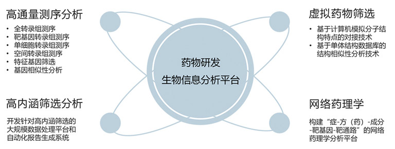 在新藥研發(fā)過(guò)程中,針對(duì)如何找到藥物作用靶點(diǎn),建立了以闡明“癥-方(藥)-成分-靶基因-靶通路”為目標(biāo)的虛擬藥物篩選平臺(tái)和網(wǎng)絡(luò)藥理學(xué)分析平臺(tái)。包括基于計(jì)算機(jī)模擬分子結(jié)構(gòu)特點(diǎn)的對(duì)接技術(shù)和基于中藥成分結(jié)構(gòu)數(shù)據(jù)庫(kù)的結(jié)構(gòu)相似性分析技術(shù),以及涵蓋了PPI蛋白互作關(guān)聯(lián)、轉(zhuǎn)錄因子調(diào)控、靶基因預(yù)測(cè)等多方面的網(wǎng)絡(luò)藥理學(xué)分析平臺(tái)。此外,整合包括全轉(zhuǎn)錄組、靶向轉(zhuǎn)錄組、單細(xì)胞轉(zhuǎn)錄組、空間轉(zhuǎn)錄組在內(nèi)的不同轉(zhuǎn)錄組數(shù)據(jù)類(lèi)型,搭建高通量轉(zhuǎn)錄組測(cè)序自動(dòng)化分析平臺(tái)。